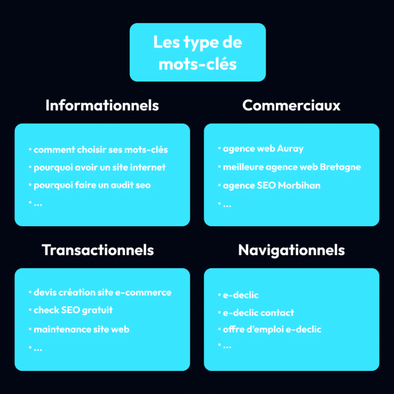 Les mots-clés se répartissent en quatre grandes catégories selon l’objectif poursuivi par l’internaute.